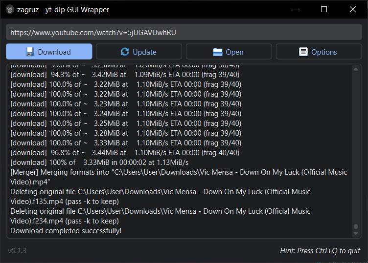 zagruz je grafické rozhraní (GUI) pro nástroj yt-dlp, jehož pomocí lze snadno stahovat video i audio soubory ze serverů YouTube, Vimeo, SoundCloud a mnoha dalších. Samozřejmostí je možnost nastavení kvality výstupních audio a video souborů a díky nástroji ffmpeg, lze provádět i konverzi multimédií do různých formátů.