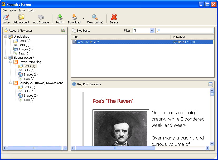 Zoundry Raven je přehledný a kvalitní WYSIWYG editor pro snadnou tvorbu blogů. Do vlastních blogů je kromě textů vkládat odkazy, fotografie, audio či video soubory a další objekty. Předností editoru je především snadné ovládání se který si poradí i méně zkušený uživatel a nutností není ani hlubší znalost HTML kódu.