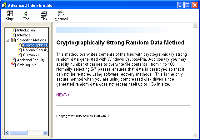 Pokud se chceme ujistit, že z daného média (pevného disku) data již nikdo neobnoví, máme v zásadě dvě možnosti. Tou první je jeho fyzická likvidace, což není ekonomicky ani časově zrovna nenáročné, druhou, pohodlnější variantou, je využití specializované aplikace, kterou je i ta dnes představovaná. Advanced File Shredder obsahuje tři metody pro dokonalé odstranění dat (mezi ně patří i způsob jenž využívá vláda Spojených států nebo Guttmanova metoda), v zásadě jde však vždy o jedno a to samé, přepsat vymazaná data novými, ať už pomocí jakéhokoli algoritmu.