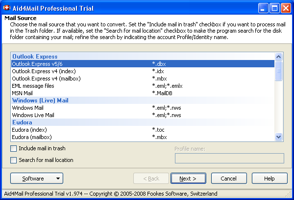 Prvním krokem k úspěšnému přesunu elektronické pošty je její lokalizování. Aid4mail podporuje několik desítek emailových klientů, jejich počet neustále přibývá. Po zvolení toho, jenž používáme, je nutné vymezit rozsah exportu (všechny adresáře, vybrané složky atd.).