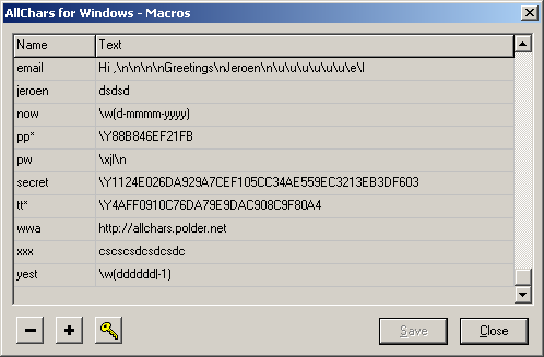 Ve dvou sloupcích otevřené tabulky vidíme příklady již vytvořených maker. V prvním je vždy zanesen aktivační příkaz, v druhém text, kterým bude nahrazen. Implicitní spouštěč maker je lomeno (/). Pokud tedy do libovolného textového pole zapíšeme např. /wwa dostaneme namísto daného shluku znaků webovou adresu http://allchars.polder.net. Aktivační příkaz je nutné zapsat poměrně rychle, jestliže tak rychlého zápisu nejsme schopni, je možné upravit dobu pro iniciaci makra v souboru allchars.ini, konkrétně zvětšením hodnoty v sekvenci MacroDelay=x, kde x je hodnotou v milisekundách (implicitně je nastavena hodnota 200). Vlastní makro vytvoříme analogickým způsobem (tedy zvolením aktivačního příkazu a samotného textu) stisknutím ikonky +.