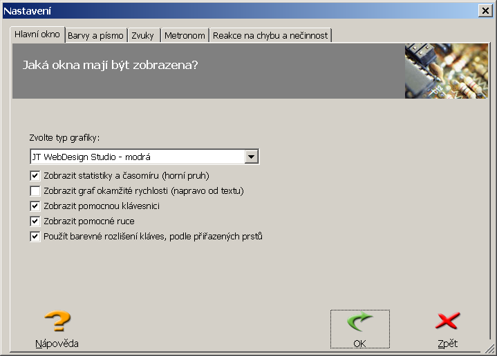 V nastavení programu je možné vybrat ze čtyř připravených skinů programu ten, který nám bude při psaní nejvíce vyhovovat. Je možné zvolit zda zobrazovat statistiky, pomocnou klávesnici, ruce či barevné rozlišení kláves, popř. prstů. Možné je volit i typ, barvu a velikost písma, stranou nezůstává ani možnost změny zvuků. Aplikace obsahuje i metronom, který si klade za cíl pomoci nám udržet příslušné tempo. V poslední záložce lze upravit, jak se má aplikace chovat v případě chybného úhozu.