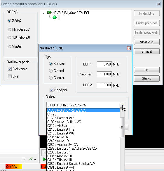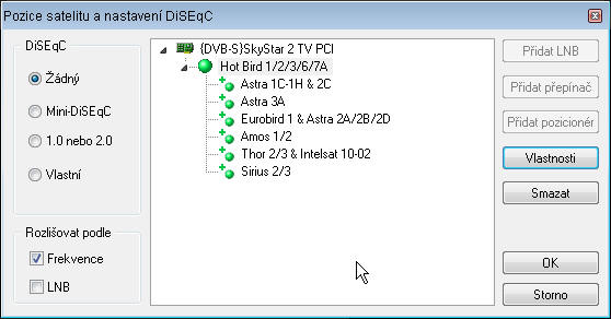 Spuštěný program vám nabídne nastavení DiSEqC. To samé docílíte volbou Nastavení → DiSEqC (klávesová zkratka Alt+D). Nastavování je poněkud nelogické, protože vychází z referenčního satelitu. Od něho se odvíjí další. Pokud nepoužíváte přepínač diseq označte Žádný, v opačném případě zvolte 1.0 nebo 2.0. Klikněte myší na položku zelenou kuličku a následně na Vlastnosti. V rozbalovací liště vyberte satelit, který bude referenční (např. Hotbird).