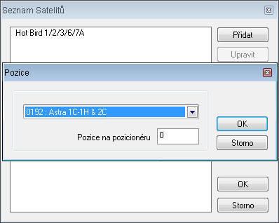 Potvrďte tlačítkem Výchozí. Klikněte na tlačítko Seznam, otevře se vám nové okno. V něm budete přidávat satelity, které chcete v budoucnu využívat.
