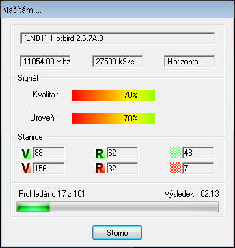 Volbou Přidat se vám otevře rozbalovací lišta pro přidávání satelitu (např. Astra 1C-1H). Potvrďte OK. Znovu volba Přidat a výběr dalšího satelitu a uložení. Až uložíte všechny satelity. V budoucnu můžete jakýkoliv satelit přidat. Dvakrát potvrdíte OK. Výsledek může vypadat taktoZa předpokladu, že máme parabolu nasměrovanou například na Hotbird 13 st.E můžeme začít skenovat jednotlivé tranpodery na této skupině družic. Ideální je pokud provádíme skenování s aktuálními INI soubory. http://joshyfun.peque.org/transponders/ nebo http://cz.kingofsat.net/.