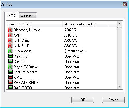 Teď stačí vybrat volně vysílaný program (zelené V) a můžete se dívat. Červené V jsou kódované stanice. Obdobně je to s radiovým vysíláním (červené a zelené R). Datové kanály mají ikonu diskety.