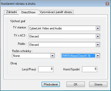 • Obraz a zvuk→ DirectShow – Tady si nastavíte, jaké kodeky chcete používat. Rovněž výběr druhu rendrování.