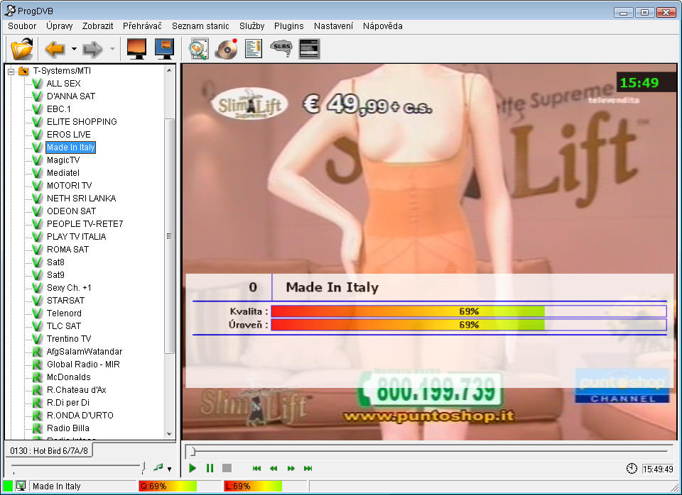 Skenování satelitů zahájíte volbou Seznam stanic na vrchní liště playera. V záložce Vyhledání stanic vyberte Hotbird a klikněte.