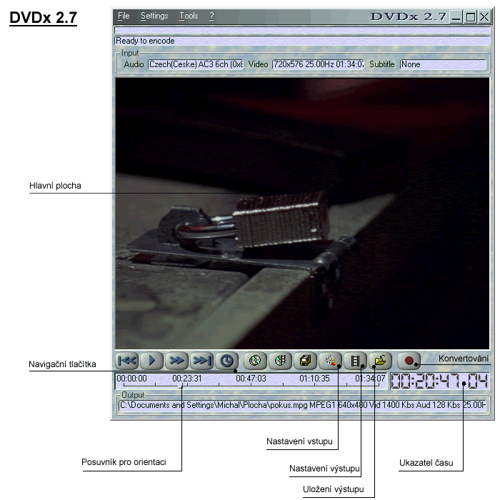 Spustíme si stáhnutý a nainstalovaný DVDx 2.7. Objeví se nám úvodní okno (viz. Obr.), které se bude zobrazovat po celou dobu práce s programem. V níže uvedených krocích si ukážeme jak jednoduše převedeme oblíbené DVD, abychom jej mohli použít v osobním přehrávači či jiných zařízeních.