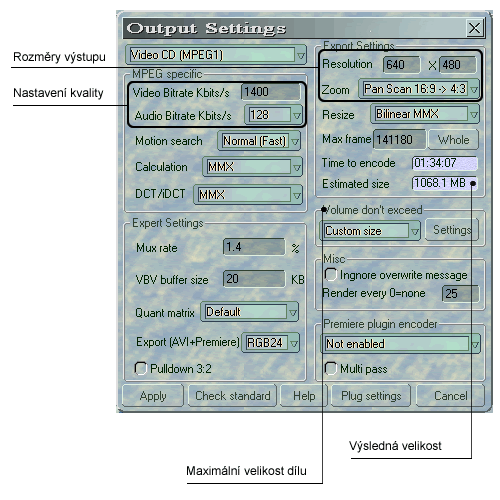 8. Důležité je ověřit nastavení výstupního souboru – „Output settings“ – viz. Obr. 3.Můžeme zde nastavit formát výstupního souboru a související vlastnosti (Audio bitrate, Video bitrate). Platí, že čím vyšší bitrate, tím vyšší kvalita. U audia je postačující 128 kbit/s – MP3. U videa by tato vlastnost měla odpovídat rozměrům výstupu. Pro většinu případů je optimální nastavení 1400 kbit/s. Další důležitou vlastností výstupu jsou rozměry. Nastavte je podle zobrazovacích možností přehrávače. Je přitom nutné dbát na to, aby každý rozměr byl dělitelný 16, jinak se konverze nepovede. Rozměry se nastavují v sekci „Export settings“. V této sekci je také možné pozorovat výslednou velikost souboru – „Estimated size“. Někdy také vznikne potřeba rozdělit celé video na více částí, aby se svou velikostí vešlo na médium. Maximální velikosti částí videa se nastavují v sekci “volume don’t exceed“. Na výběr je z několika možností, včetně vlastního nastavení velikosti. Vše potvrdíme tlačítkem „apply“ a můžeme pokračovat.