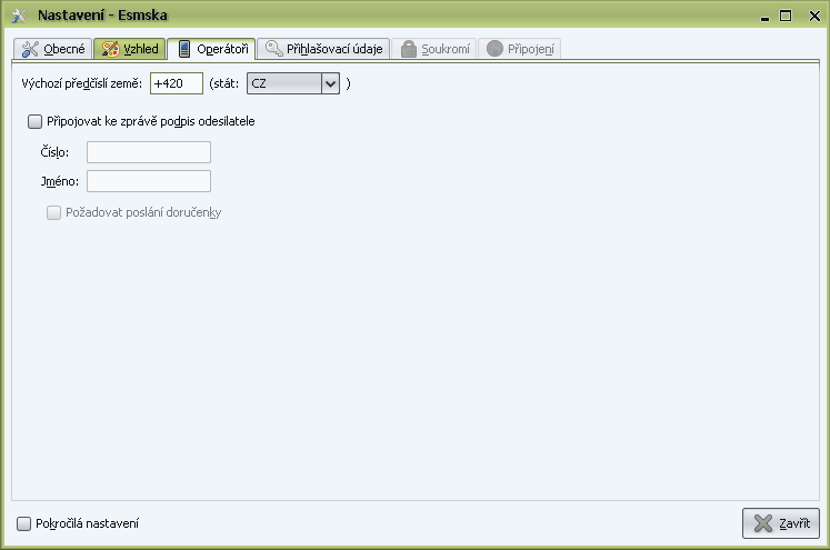 Již při spuštění programu nás čeká milé překvapení, vše je v českém jazyce. Tím se naše práce velmi zpříjemní a zjednoduší. Prvně bychom si měli zkontrolovat nastavení programu, skrývá se pod tlačítkem překříženého klíče a šroubováku (je druhé zprava). Zde bychom si určitě měli zkontrolovat nastavení pod záložkou Operátoři. Nastavení by mělo být tak, jak je uvedeno na obrázku. Záložka Přihlašovací údaje slouží jenom k identifikaci při používání odesílání přes placené brány. My však tuto službu využívat nebudeme, protože budeme odesílat zprávy přes neplacené brány zdarma.