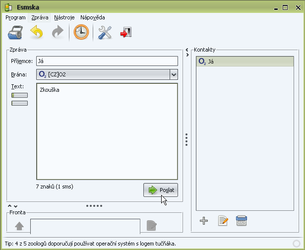 Nejdříve si vybereme uživatele mezi Kontakty a dvojitým poklikáním levým tlačítkem myši ho určíme příjemcem. Jeho jméno či přezdívka se přesune do pole Příjemce a v poli Brána bude zapsána síť jeho mobilního operátora. Nyní již můžeme psát zprávu do pole Text a napsanou zprávu odešleme stisknutím tlačítka Poslat. Před každým odesláním SMSky musíme opsat zobrazený kód z obrázku.