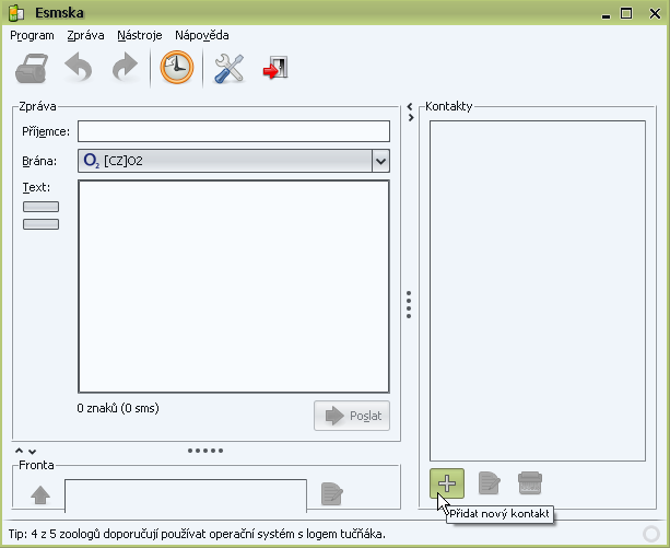 Pro rychlejší a přehlednější odesílání zpráv je dobré, vytvořit si seznam kontaktů. Nový kontakt si přidáme tlačítkem “+” vlevo dole, jak je vidět na obrázku. Do nově vzniklého okna Nový kontakt napíšeme jméno či přezdívku příjemce a doplníme jeho telefonní číslo. Předvolba +420 by měla být již předplněna. Mobilního operátora nastavíme buď na O2, pro zasílání do sítě O2, T-mobile pro síť T-Mobile nebo Vodafone pro síť Vodafone. Žádné jiné protokoly nefungují, nebo nejsou zdarma.
