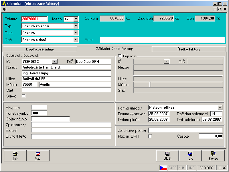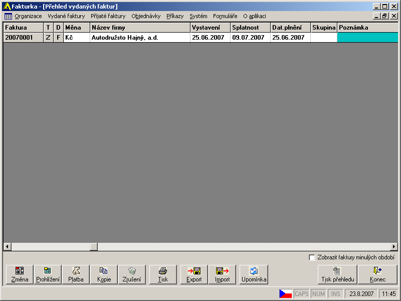 Pro přehled o přijatých či vydaných fakturách je k dispozici funkce Přehled faktur, každá z nich je asociována s objednávkami, dodacími listy, evidencí firem nebo datovými číselníky. Užitečným nástrojem je Kniha pohledávek, prostřednictvím které můžeme zobrazit veškeré závazky k vybrané firmě, ať už z naší nebo z její strany. Evidovat lze i příkazy k úhradě, ani v tomto případě nechybí kompletní asociace, všude kde je to užitečné lze k jednotlivým záznamům vkládat poznámky pro lepší orientaci.