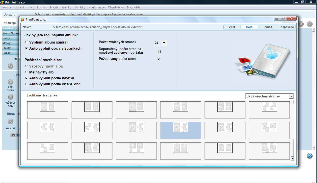 Dalším krokem je výběr stylu, jakým se budou fotografie do alba vkládat. K dispozici jich je mnoho. Podle počtu fotografií, které chcete ve fotoknize mít, si můžete zvolit typy od jedné fotografie na jednu stranu, až po šest fotografií umístěných na jedné straně. Celá fotokniha nemusí být stejná, design každé stránky lze zvolit samozřejmě zvlášť. Máme zde ještě možnost automatického vyplnění fotek do knihy, což nám usnadní práci. Dále již pak stačí vybrat pozadí alba (buď barvu či obrázek) a můžeme se pustit do finální fáze přípravy. Tou je vlastní úprava jednotlivých stránek knihy.