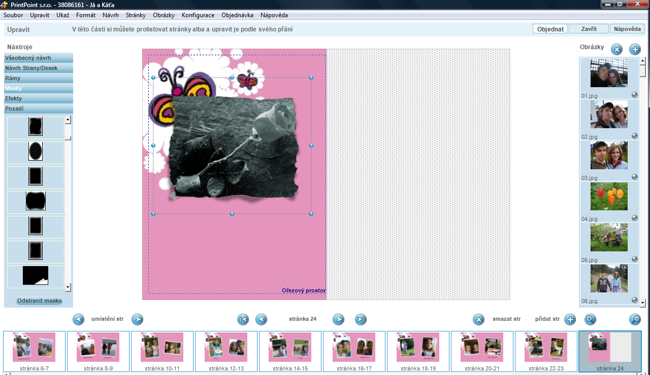Program AlbumMakerumožňuje upravit každou stránku knihy zvlášť. Ať už se jedná o pozadí stránky či různé efekty, masky a rámy aplikované na fotografie. Těch je k dispozici opravdu slušné množství, a tak je zde spousta prostoru pro „hračičky“, kteří chtějí doladit svou fotoknihu k dokonalosti. Nijak nepřekvapí efekty, ty patří mezi ty klasické (black and white, blue, green atp.). Překvapí však škála již zmíněných masek a rámečků, ta je totiž opravdu bohatá a vybere si zde opravdu každý. Ke každé fotografii je navíc možnost přidat vlastní komentář, které blízké určitě potěší. Při této editaci bohužel nepotěší pouze jeden krok, o který se můžete vrátit zpět.