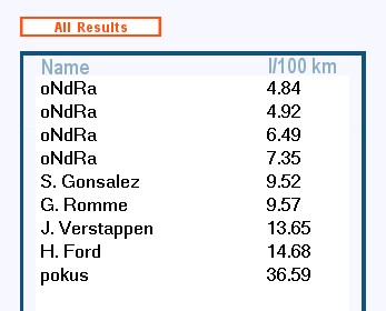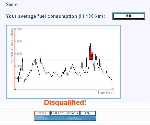 Po vypršení časového limitu přiděleného pro jízdu jste vyzváni k zadání jména řidiče. To je zobrazeno ve výsledkové listině. Zároveň s tím se před vámi otevře nové okno s přehledným grafem, jenž vám názorně ukáže, kdy jste řadili příliš pozdě a ve vysokých otáčkách motoru. V horní části se taktéž dozvíte průměrnou spotřebu paliva.