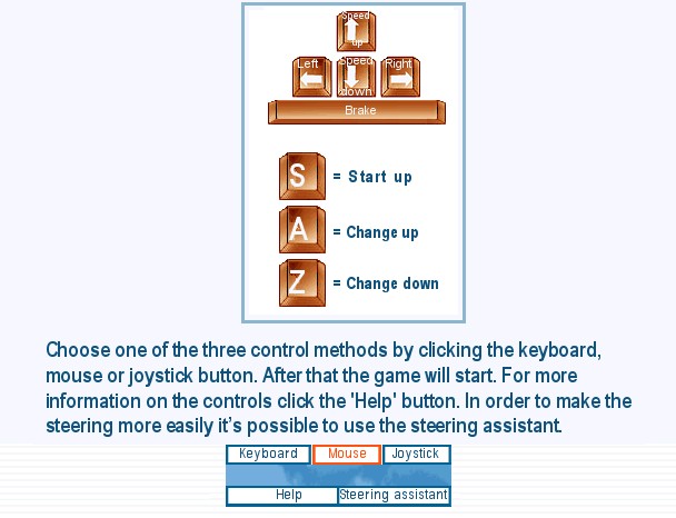 Po zvolení možnosti Start game se dostaneme k dalším nastavením hry. Tentokrát vybíráme zařízení, s jehož pomocí budeme hru ovládat. Lze si vybrat mezi klávesnicí, myší a joystickem. Samozřejmě zde nechybí k jednotlivým zařízením propracovaná nápověda. V tomto okně lze také přizvat na pomoc „Asistenta řízení“. Ten se snaží během jízdy dovést hráče k co nejnižší spotřebě paliva.