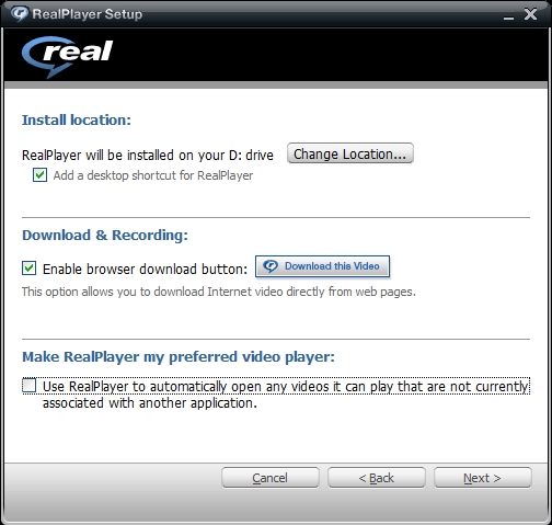 Real Player verze 11 má mnohem čistší a méně těžkopádný instalační proces, který nabízí větší možnosti výběru. Můžete jednoduše vybrat, zda chcete nastavit RealPlayer jako hlavní přehrávač, nastavit lokaci pro nainstalování, nebo zakázat instalování doplňku ke stahování videí z internetu. Během procesu instalace Real Playeru si můžete zvolit také instalaci webového prohlížeče Google Chrome.