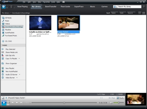 Když jsme u toho stahování, velmi užitečná funkce je možnost stáhnout téměř jakéhokoliv streamované video z internetu. Spolupráce s Youtube je samozřejmostí, Real Player 11 ale zvládá bez problému i stahování z českých stránek s videi. Malý zádrhel by se zde našel, jelikož u většiny webů s videi je zakázané je prohlížet či dokonce stahovat programy třetích stran.