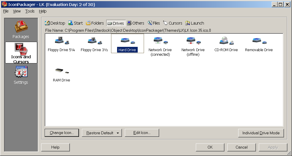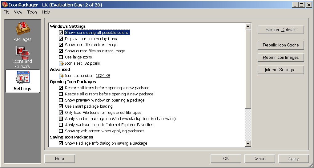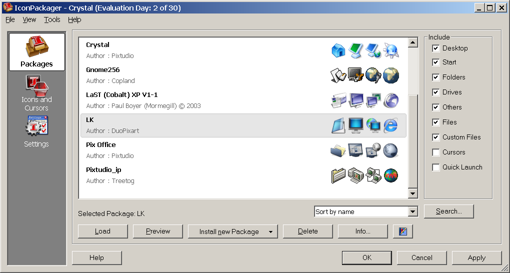 První kategorie, Packages, slouží k samotnému provedení změny. Od výrobce programu dostaneme několik balíčků ikon k vyzkoušení, na Internetu jsou jich však připraveny stovky ke stažení zdarma. Začít můžeme např. na stránce Wincustomize.com. Po výběru kýženého balíčku stiskneme tlačítko Load pro jeho zavedení a dále Apply pro samotné provedení změny. V pravé části okna máme možnost určit, zda měnit ikony na pracovní ploše, ve Start menu, ikony adresářů, disků či kurzory myši. Celkem existuje 9 volitelných parametrů.