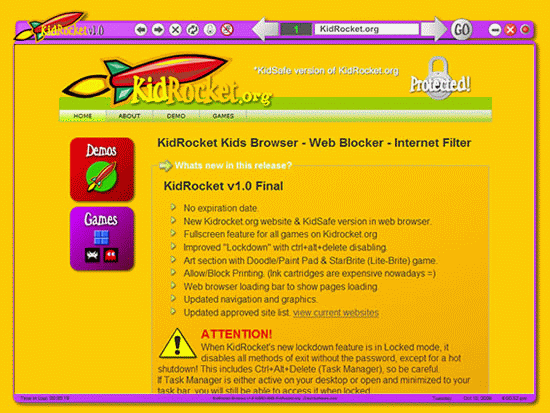 KidRocket, přehledný a bezpečný dětský internetový prohlížeč, je vytvořen pomocí Flash technologie. V programu je pevně omezen počet webových stránek, které lze navštívit. Těchto stránek je celkem 13. Kromě toho je součástí prohlížeče také program pro zkoušení dětí z počtů a dva zajímavé dětské kreslící nástroje. Aplikaci je navíc možné spustit ihned po stažení bez nutnosti instalace.