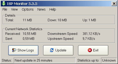 Program ISP Monitor je vynikající aplikace pro zobrazování aktuálního přenosu dat a sčítání jeho množství v čase. Disponuje tvorbou podrobných statistik, vzhled programu je plně nastavitelný. Nádavkem nabízí kontrolu emailu, nových informací na webu nebo test rychlosti. Pádným argumentem je pro používání je cena, program je zdarma.