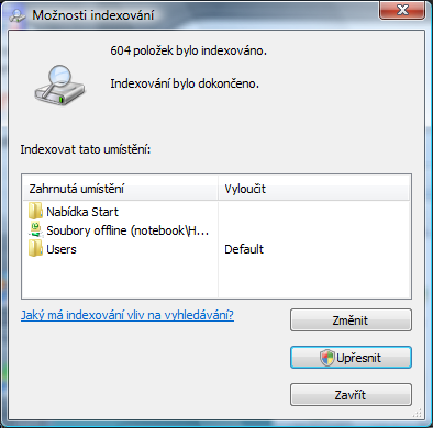 Indexování disku probíhá i průběžně, takže obsah indexu vždy odráží obsah indexovaných složek. Neindexují se totiž ani zdaleka všechny soubory, ale jen vybrané složky na disku. Indexování sice není extrémně náročné na výkon počítače, ale pokud by měl být indexován kompletní obsah pevného disku, mohlo by se to již na výkonu počítače negativně projevit.