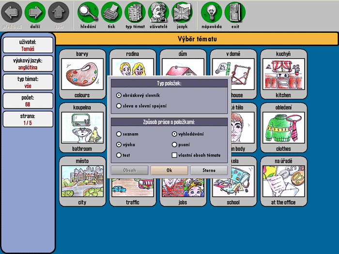 Ke každé výukové položce je možné namluvit vlastní výslovnost a tu pak porovnávat s výslovností rodilého mluvčího. Program dále obsahuje obousměrný překladový slovník, který Vám snadno a rychle umožní vyhledat všechny dostupné překlady zadaného výrazu, zjistit jeho výslovnost a v jakém tématu se výraz nachází.