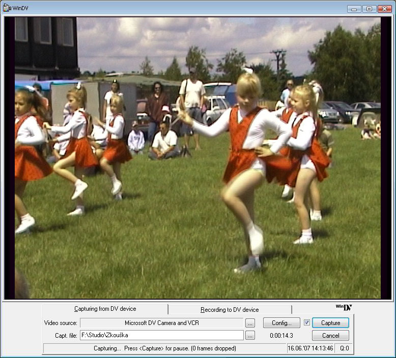 Pro zachytávání si autor oblíbil jednoduchý Freeware prográmek – utilitu českého autora pod názvem WinDV. Prakticky nemusíte nic nastavovat. (Poznámka: Při ukládání originální DV nahrávky z kamery umí WinDV uložit soubory na harddisk podle střihu kameramana a s uvedením data a času pořízení nahrávky v názvu souboru. Vynikající věc pro další práci!)
