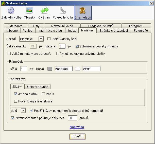 Jestliže si pro tvorbu alba nevystačíme s přednastavenými šablonami, není problém jakýkoliv nevyhovující parametr upravit v nastavení. Možnosti jsou neuvěřitelně rozsáhlé. Je možné nastavit vše od formátu obrázků, jasu a kontrastu, počtu jednotlivých fotografií na řádku přes kódování a zdroje komentářů až po metadata nebo informací o albu. Jestliže nás množství funkcí tak trochu vyděsí, a přesto chceme jiné styly než ty defaultní, není nic jednoduššího než stáhnout nové z internetu přímo prostřednictvím programu.