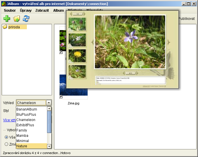 Pokud chceme mít lepší představu o použitých vstupních materiálech, je možné je všechny prohlédnout (zkontrolovat) za pomoci integrované prezentace. Jestliže se nechceme pouštět do pokročilé konfigurace vzhledu a stylů, stačí poklepat na tlačítko Vytvořit album. Po dokončení avizované operace můžeme nechat program ihned výsledek vyobrazit.