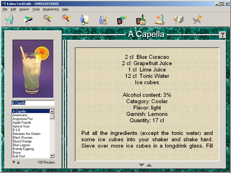 Celkový počet koktailů dosahuje úctyhodné hodnoty 1100. K dispozici jsou nápoje nealkoholické i ty s větší nebo menší mírou alkoholu. U každého z receptů je vyobrazena vzorová podoba koktailu v podobě fotografie. V hlavním okně nalezneme výpis všech ingrediencí a podrobně popsaný postup výroby. Na každou z přísad je možné kliknout, čímž zjistíme užitečné informace o ní, ať už se jedná o hlavní účel využití nebo její užívání v průběhu času.