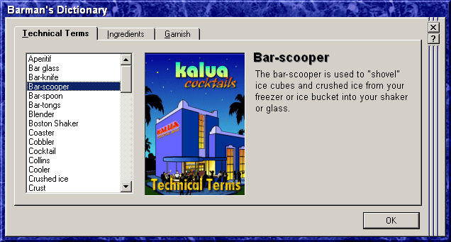 Pokud bychom měli problém porozumět některému z termínů užitých v popisu přípravy (ať už oborovému nebo slangovému) lze využít opravdu rozsáhlý slovník barmana, ve kterém nalezneme jejich podrobné vysvětlení.