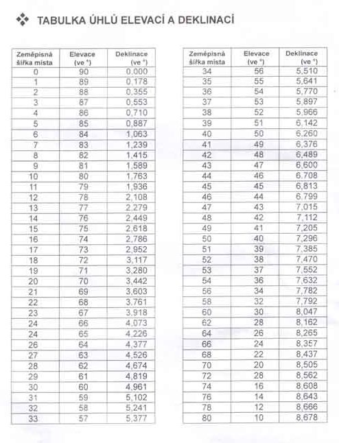 Držák paraboly na chobotu motoru dotáhneme a ve vodorovném směru s ní již nehýbeme. Teď nastavíme uhel deklinace na parabole. Ten vyčteme z tabulky uvedené v Manuálu pro motor na str. 6. Hodnota odpovídá řádku s vaší zeměpisnou šířkou. Pro Česko se pohybuje v rozmezí 7,1 –7,4. Tuto hodnotu přičteme k zeměpisné šířce a odečteme od 90 (například pro Olomouc 90-(49,5+7,2) POZOR. Tohle je ale výpočet pro středovou parabolu!