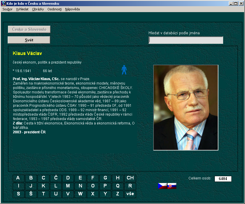 Hledáte encyklopedii, jež poskytne základní údaje o osobnostech ze všech oblastí působnosti? Databáze programu Kdo je kdo v Česku, Slovensku a ve světě obsahuje téměř 20 000 záznamů doplněných o 4600 obrazových materiálů. Umožňuje vyhledávání dle rozličných parametrů a je plně editovatelná.