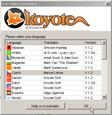 Ihned po skončení instalace budeme moci program spustit. Při prvním spuštění budeme vyzváni z výběru jazyka. Implicitně je vybrána angličtina. Nemusíme však nijak zoufat, český jazyk je zde obsažen též a přeloženo je vše potřebné. Označíme tedy českou vlaječku kliknutím levým tlačítkem myši a potvrdíme OK.