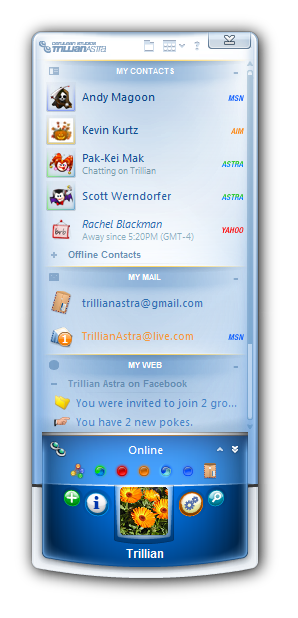 Na které platformy se Trillian chystá zaútočit tentokrát? Kromě obligátní podpory Windows a Mac OS X bude program nově také v mobilní „jablečné“ verzi pro iPhone, malou revolucí na poli komunikačních programů pak bude služba Trillian Mini – na adrese www.astra.im sídlící Flashem poháněná verze programu, která si v ničem nezavdá s populárním webovým komunikátorem meebo. Díky ní tak bude ke komunikaci po většině Astrou podporovaných protokolů stačit pouze webový prohlížeč.