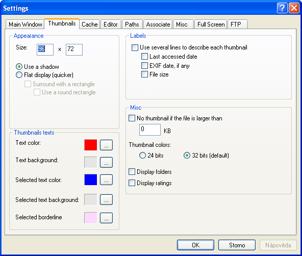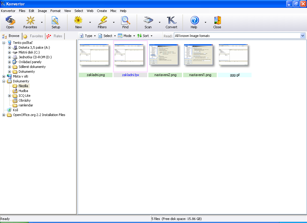 Při prvním spuštění je automaticky otevřeno nastavení, pokud se jím nechceme ihned zabývat, můžeme jej s klidem zavřít, program pro svou činnost žádný uživatelský zásah nepotřebuje. Interface programu je rozděleno do tří oken. V levém okně se nachází stromová struktura lokálních disků, zde vybíráme soubory určené pro zobrazení v okně pravém. Nad zmíněnými okny jsou poměrně velké ikony se základními funkcemi, ještě výše je položen panel s kompletním menu.