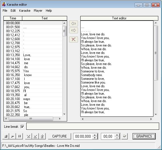 Tlačítko ED otevře okno editoru Karaoke, kde můžete opravit text písně, případně vytvářet svoje texty, včetně časování zobrazování a ty následně uložit ve formátu LRS.