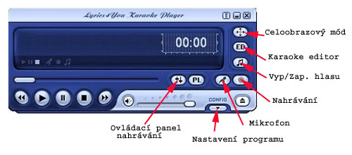 Jak již bylo řečeno, základní ovládání je totožné s WinAmpem. Tlačítka Play, Pauza, Stop a přeskok na další skladbu fungují stejně. Další tlačítko umožní zobrazení textu na celé obrazovce monitoru, případně ke grafické kartě připojené TV.