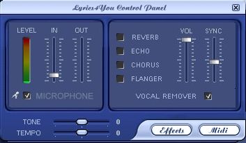 Otevřením okna Ovládacího panelu nahrávání můžete použít pro vaši nahrávku zpěvu různé efekty echo, chór. Volba VOCAL REMOVER v tomto okně umožní v originální MP3 nahrávce, s větším či menším úspěchem potlačit hlasitost původních vokálů. Není to stoprocentní a projeví se to na kvalitě přehrávání, hlavně u výšek. Jiná situace je u CD vytvořených speciálně pro Karaoke. Pak stačí převést CD do formátu MP3 a je vystaráno. V případě použití formátu MIDI máte možnost úpravy 16-ti kanálů MIDI. Včetně hlasitosti, volby nástroje pro každý aktivní kanál.