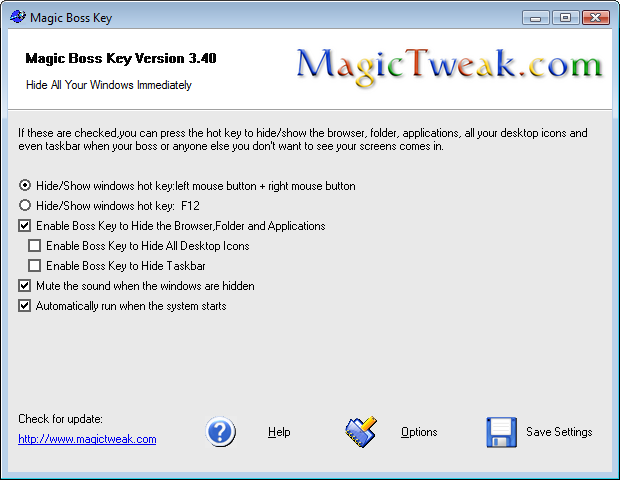 Protože zavřít nebo alespoň minimalizovat rychle všechna okna může být někdy docela problém, jednoduchý prográmek Magic Boss Key, který si dnes představíme, vám jistě přijde vhod právě v těch situacích, kdy nechcete, aby vaše okolí vědělo, co se na obrazovce počítače zrovna děje.