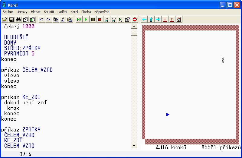 Karel je robot, který chodí, běhá, pokládá značky, staví zdi a další. Je zdarma, česky, bez nutnosti instalace. Obsahuje pouze omezený počet příkazů, disponuje jednoduchým prostředím, poměrně dobrou nápovědou a několika vzorovými příklady. Pokud máte zájem o další, zkuste použít příklady dostupné na internetu.