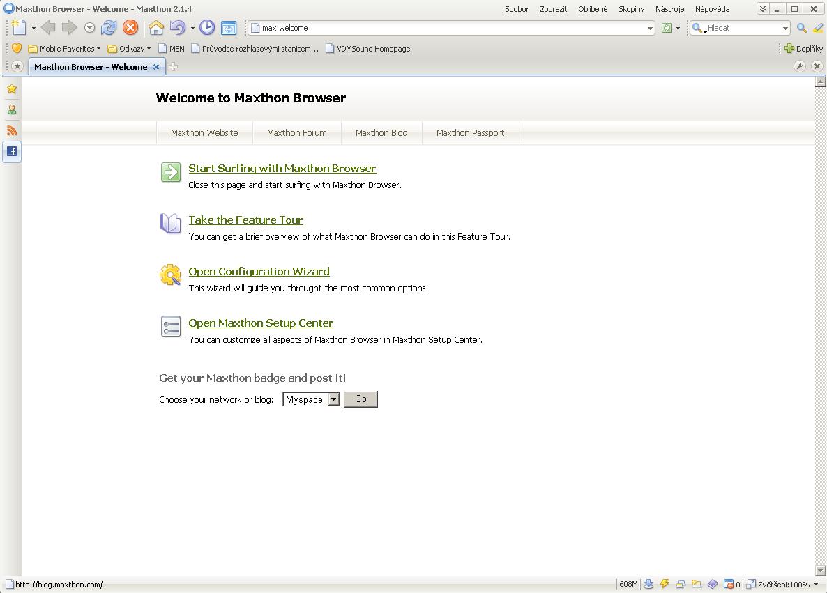 Po stažení krátkého instalačního balíčku a jeho instalaci mě v první řadě překvapila tabulka s požadavkem na vytvoření osobního účtu. Připadá mi totiž zbytečné, že bych měl za používání obyčejného webového prohlížeče podávat někde někomu svůj e-mail a další informace. Zvolil jsem tedy sdílený účet a ihned poté mě už přivítala obvyklá startovní obrazovka se standardními funkcemi. Ihned jsem se zorientoval a nahoře nalezl záložku „Nástroje“, pod kterou se rozbalila nabídka možností včetně nabídky „Nastavení Maxthon“. Zde již bez problému naleznete nastavení domovské stránky, firewallu, oblíbených položek, klávesových zkratek, ale v neposlední řadě i nastavení RSS čtečky, ochrany prohlížeče, stahovače souborů, nastavení skinů a doplňků. Po prohlédnutí tohoto nastavení a doladění prohlížeče svým potřebám jsem již neváhal program vyzkoušet. Musím přiznat, že Maxthon běžel po celou dobu korektně, ani jednou mi nespadl a jeho svižnost a rychlost byla skutečně znát. Já za sebe říkám, že je to velmi dobrý prohlížeč a pokud stále používáte Internet Explorer, měli byste Maxthon minimálně vyzkoušet.