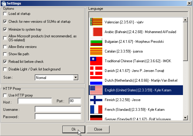 Samotný program SUMo se skrývá pod nenápadnou šedobílou ikonkou, stačí dvakrát poklikat a už je aplikace v provozu. Hned při spuštění máme možnost upravit si program k obrazu svému. Bohužel však zjišťujeme, že česky byla pouze instalace a program sám o sobě česky dostupný není. Musíme se tedy spokojit s anglickým prostředím. Pod tlačítkem Open SUMo Settings se skrývá nastavení aplikace, kterým vás nyní provedu. Asi nejvýraznější zde bude nastavení jazyka, ale českou vlajku zde bohužel nenajdeme. Někomu však může třeba lépe vyhovovat jazyk německý. Není problém si ho tu změnit, změna je okamžitá. První zátržek (Load at startup) nám určuje, zda chceme či nechceme spouštět program při spuštění PC. Druhý nám říká, zda se má při spuštění programu hledat aktualizace software. Doporučuji jej zatrhnout. Následující položka umožňuje minimalizaci až to try lišty(lišta s časem). Zbývající položky radím nechat tak, jak jsou. Pro potvrzení stiskneme OK. Po nastavení můžeme úvodní okénko uzavřít klepnutím na Close.