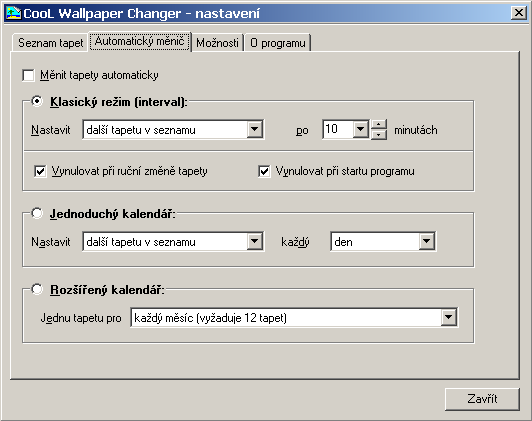 Sekce automatického měnění je velmi mocným nástrojem při zachování jednoduchosti a přehlednosti. Především si tu můžeme zapnout samotnou automatickou změnu. Režimy změn jsou tu celkem tři. Jednak jde tapetu nahradit další položkou ze seznamu či tapetou náhodnou po určitém počtu minut. Za druhé pomocí jednoduchého kalendáře (nová či náhodná tapeta každý den nebo měsíc). A je tu do třetice i rozšířený kalendář pracující s méně běžnými režimy jako je 365+1 tapeta na celý rok nebo 12 tapet pro každý měsíc v roce.