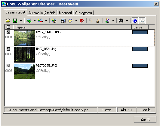 CooL Wallpaper Changer III je tvořen čtveřicí záložek. První je věnována seznamu tapet a práci s nimi. Právě sem si můžeme přidat tapet, kolik chceme, a to buď ve formě jednotlivých souborů, anebo rovnou celých adresářů. Lze odsud tapety přímo poklepáním měnit, ukládat jejich seznamy, mazat ty, co nás již nezajímají, upravovat jejich vlastnosti (typ umístění – dlaždice, roztáhnout atd.), vybrat si náhodou tapetu, řadit seznamy, případně si brýlemi úplně vpravo nechat zobrazit náhledy snímků.