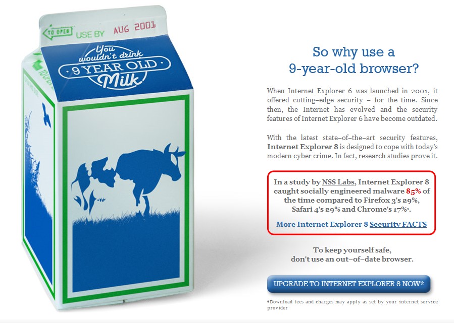 Samotný Microsoft by se také rád zbavil přítěže v podobě technologicky zastaralého prohlížeče. Musí však po danou dobu garantovat podporu svého produktu. Nezbývá mu tak nic jiného, než se snažit uživatele přesvědčit, aby začali používat novější verzi aplikace. Netradiční způsob přesvědčování přitom zvolila australská pobočka společnosti Microsoft, která ve své kampani přirovnává Internet Explorer 6 k devět let starému mléku a pokládá uživatelům otázku, zda by „pili“ devět let staré mléko. Současně nabízí zájemcům nejnovější osmou verzi Internet Exploreru.