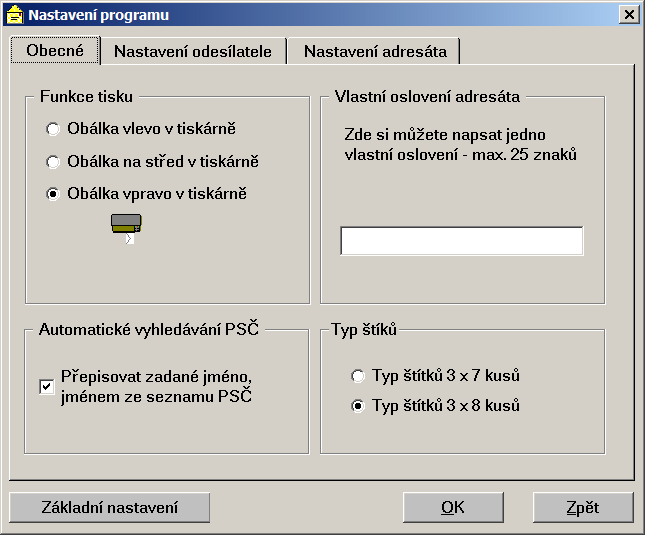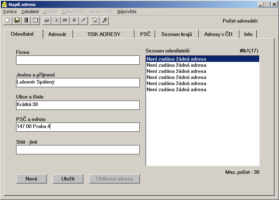 Hned první dvě záložky, Odesílatel a Adresát, vypovídají o svém účelu již svým názvem. Jejich vepisování probíhá jednoduše prostřednictvím připravených kolonek, lze vytvářet jejich seznamy pro příští použití. V kategorii Tisk adresy zvolíme jedno ze seznamu oslovení (máme možnost vložit i vlastní, pokud požadované nenalezneme), a především určíme typ obálky, na které bude adresa umístěna, pro korektní vytištění. Pokud obálky určené pro tisk vkládáme jinam než na pravou stranu podavače tiskárny, upravíme požadovanou polohu v nastavení programu. Jak bude výsledný výstup vypadat můžeme zkontrolovat v Náhledu, jestliže je vše jak jsme zamýšleli, můžeme přejít k samotnému vytištění.